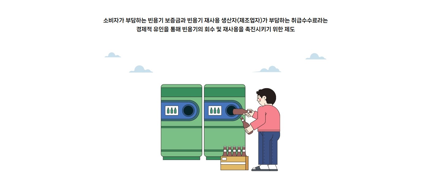일회용품 사용을 효과적으로 관리 및 줄이기 위하여 보증금 제도로써 공병, 빈병을 회수하면 그에 맞는 가격을 보상받는 시스템입니다. 소비자가 부담하는 빈용기 보증금 + 재사용 생산자 (제조업자)가 부담하는 취급수수료를 통하여 회수 및 재사용을 촉진시킵니다.