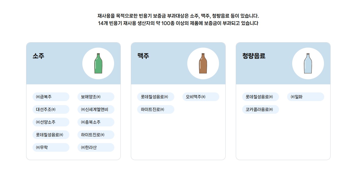 보증금대상사업자를 반드시 확인하시고 빈병, 공병을 이에 맞추어 재사용에 동참하시기 바랍니다.