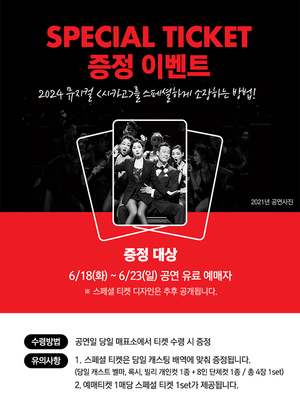 수령 방법으로는 공연일 당일 매표소에서 티켓 수령 시 증정합니다. 스페셜 티켓은 당일 캐스팅 배역에 맞추어 증정이 되며 해당일의 캐스팅 벨마, 록시, 빌리 개인컷 1종과 8인의 단체컷 1종으로 총 4장이 1 set입니다. 예매 티켓은 1매당 스페셜 티켓 1 set가 제공이 된다는 점 유의하시길 바랍니다.