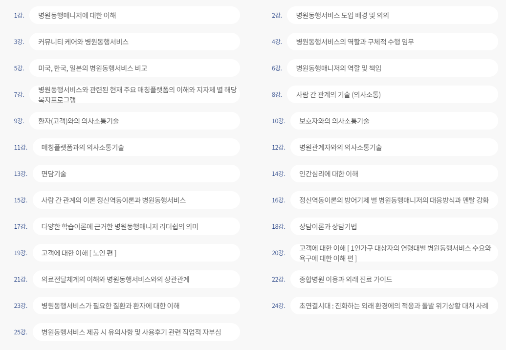 과정소개입니다. 1강부터 25강까지 있으며 하단과 같은 과정들을 교육받습니다.