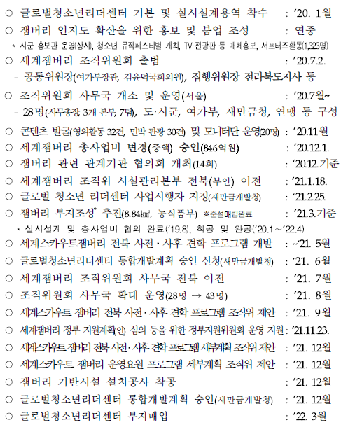 어이가 없을 정도로 막대한 사업비가 투입되었는데 이 또한 기사를 확인해 보니 2배가량 늘어난 사업비라고 합니다. 추진기관은 여성가족부, 전라북도, 한국스카우트연맹, 세계잼버리 조직위원회라고 나옵니다.