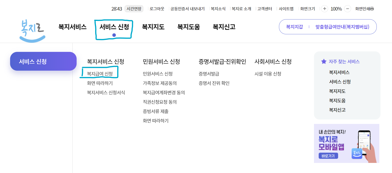 서비스신청 - 복지급여 신청 (로그인되어있어야 합니다!)