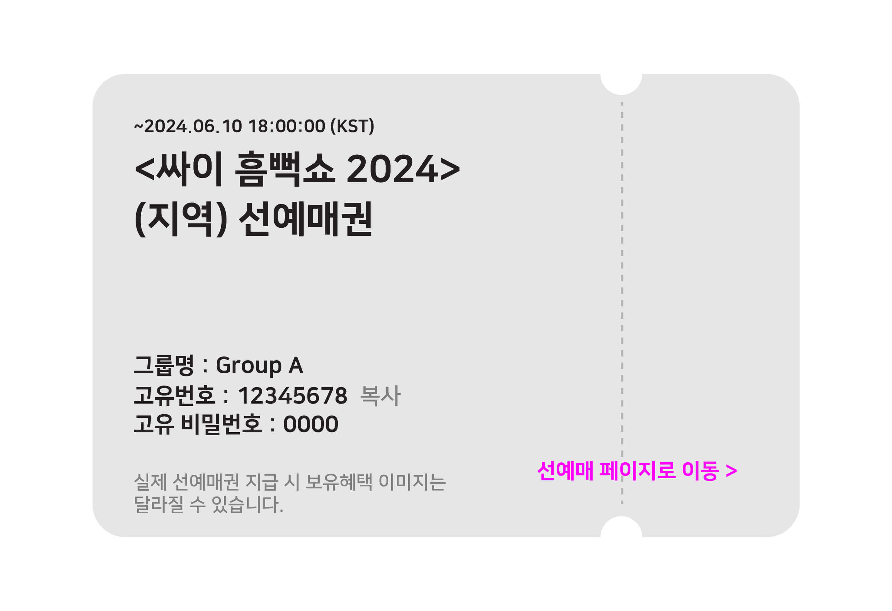 - soPSYety 홈페이지 > MY PAGE > 보유 혜택 > 선예매권 내 [그룹명/ 고유번호/ 고유 비밀번호]
