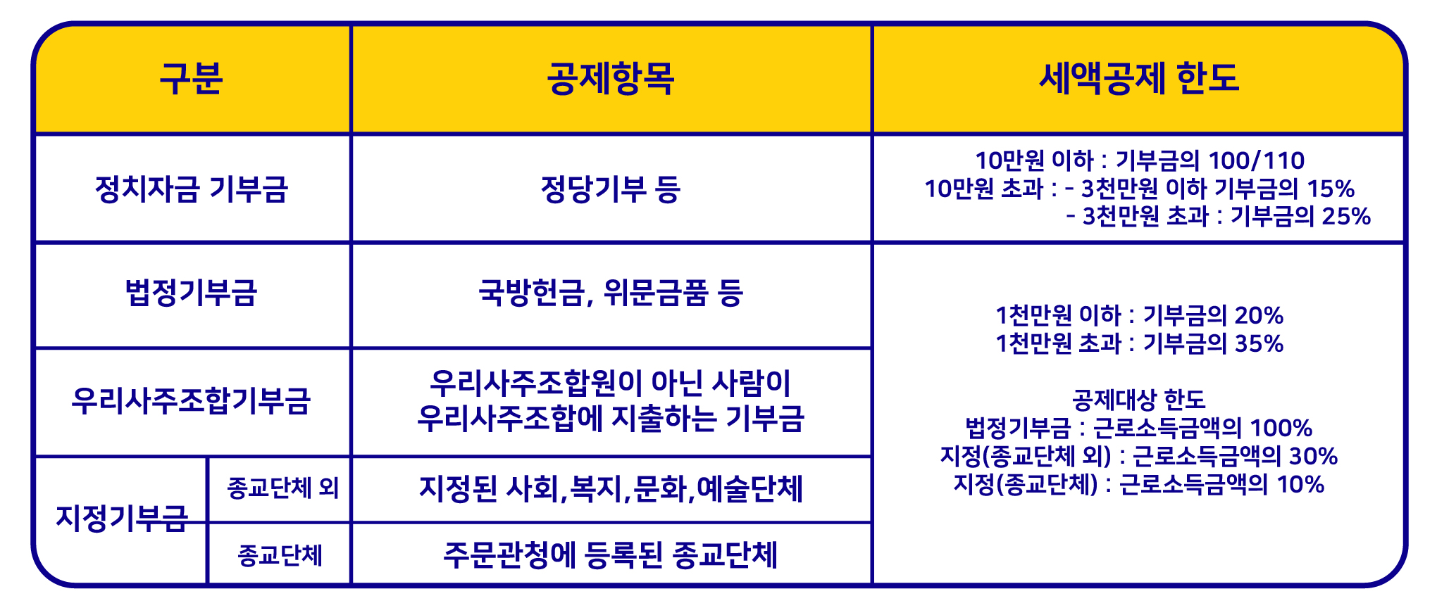 종교인들의 대부분의 기부금 공제는 종교단체 기부금일 겁니다. 종교단체의 경우 근로소득의 10%가 공제 한도입니다.