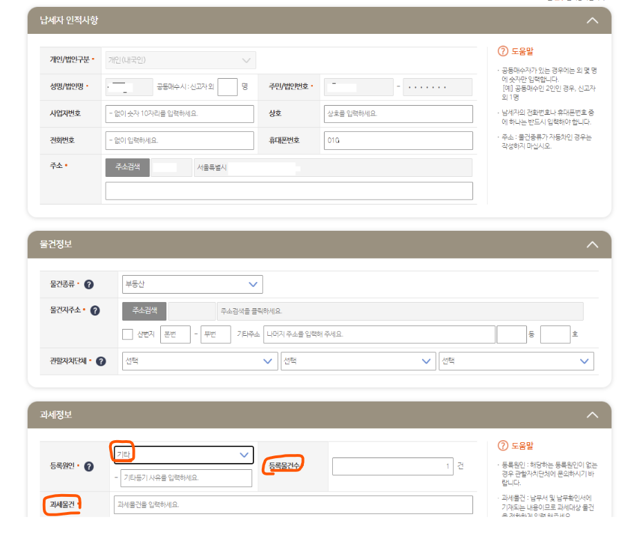 3. 납세자 인적사항, 물건정보, 과세정보를 기입합니다.