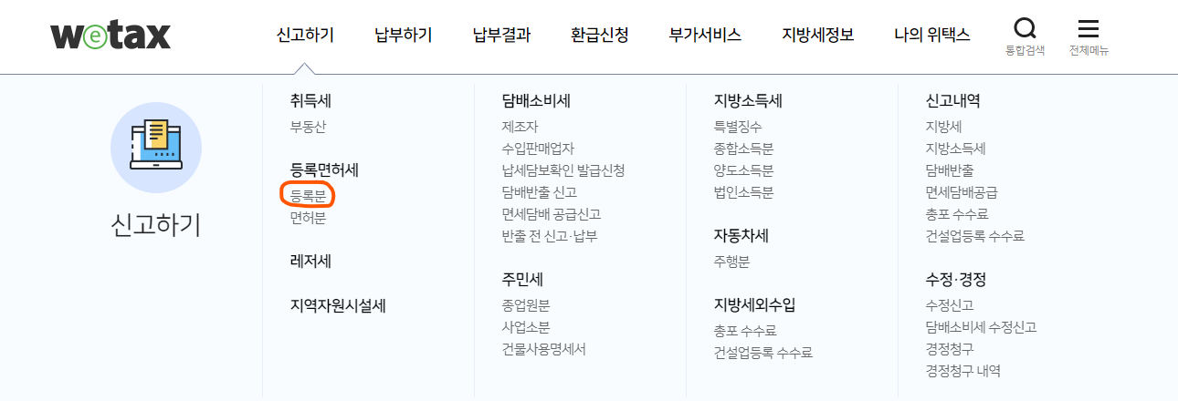 2. 상단에 신고하기 탭에서 등록면허세에 등록분을 클릭합니다.