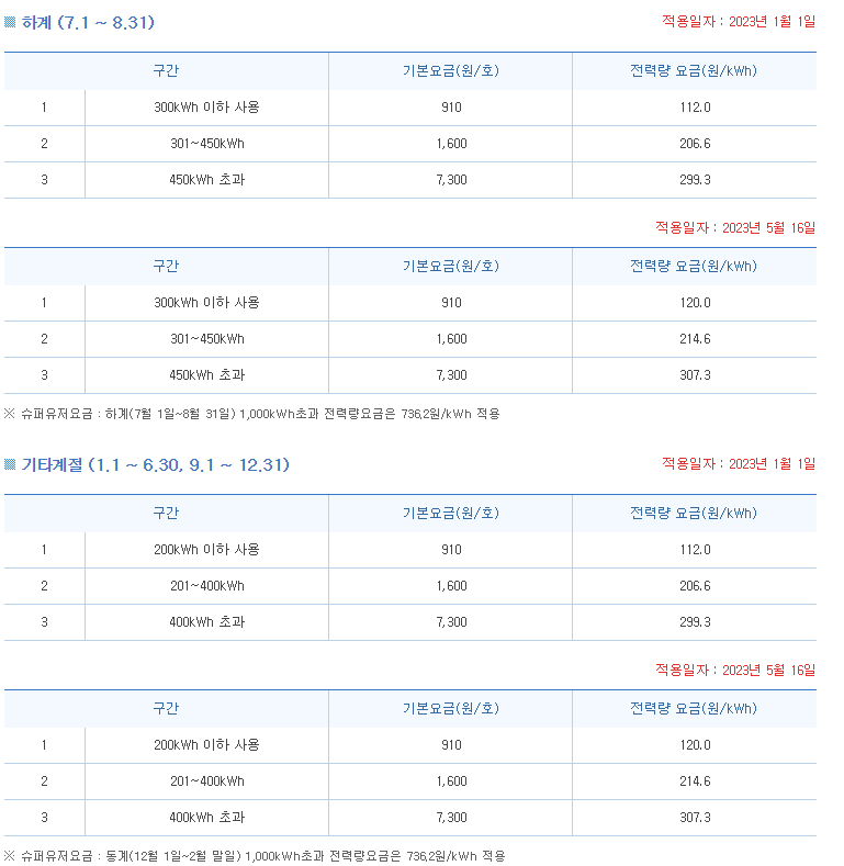 - 계약전력 3KW 이하의 고객(농사용, 가로등, 임시전력은 해당 계약종별을 적용)