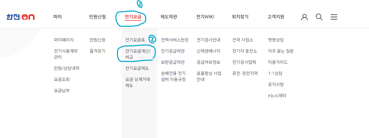 상단에 전기요금을 클릭합니다! 전기요금의 하단 메뉴인 전기요금계산/비교를 클릭합니다!