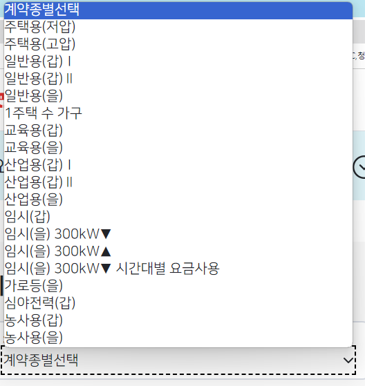 전기요금계산/비교를 클릭하여 들어가면 계약종별 선택을 하는 버튼이 있습니다. 이를 클릭하여 개인 에어컨에 맞는 종별을 선택합니다.