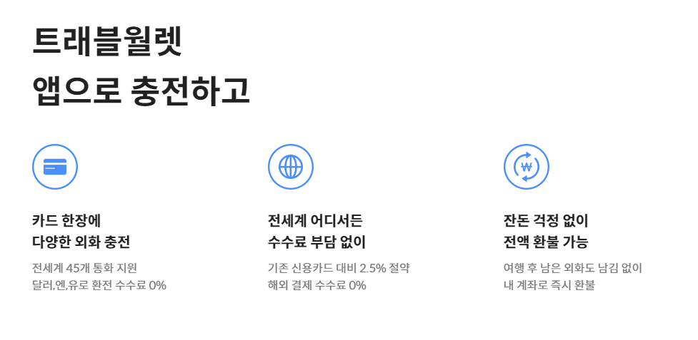 트래블월렛은 외화를 환전 및 충전 그리고 카드를 등록하여 사용하실 수 있는 앱입니다. 그리고 원화 -> 외화 외에도 외화 ->외화도 가능한 편리한 앱입니다.