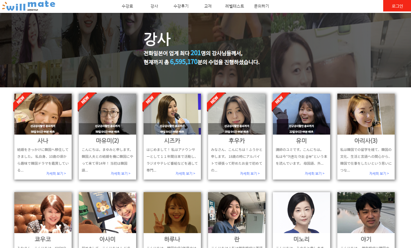 월메이트의 가장 큰 장점은 전화 일본어 수업이 가능할 수 있게 해주는 200명의 강사들 덕분입니다. 전부 원어민으로 구성되어 있으며 강사들도 다양한 지역, 다양한 나이대로 구성되어 있습니다. 월메이트 홈페이지에서 강사들의 사진과 정보를 한 눈에 확인하실 수 있습니다.