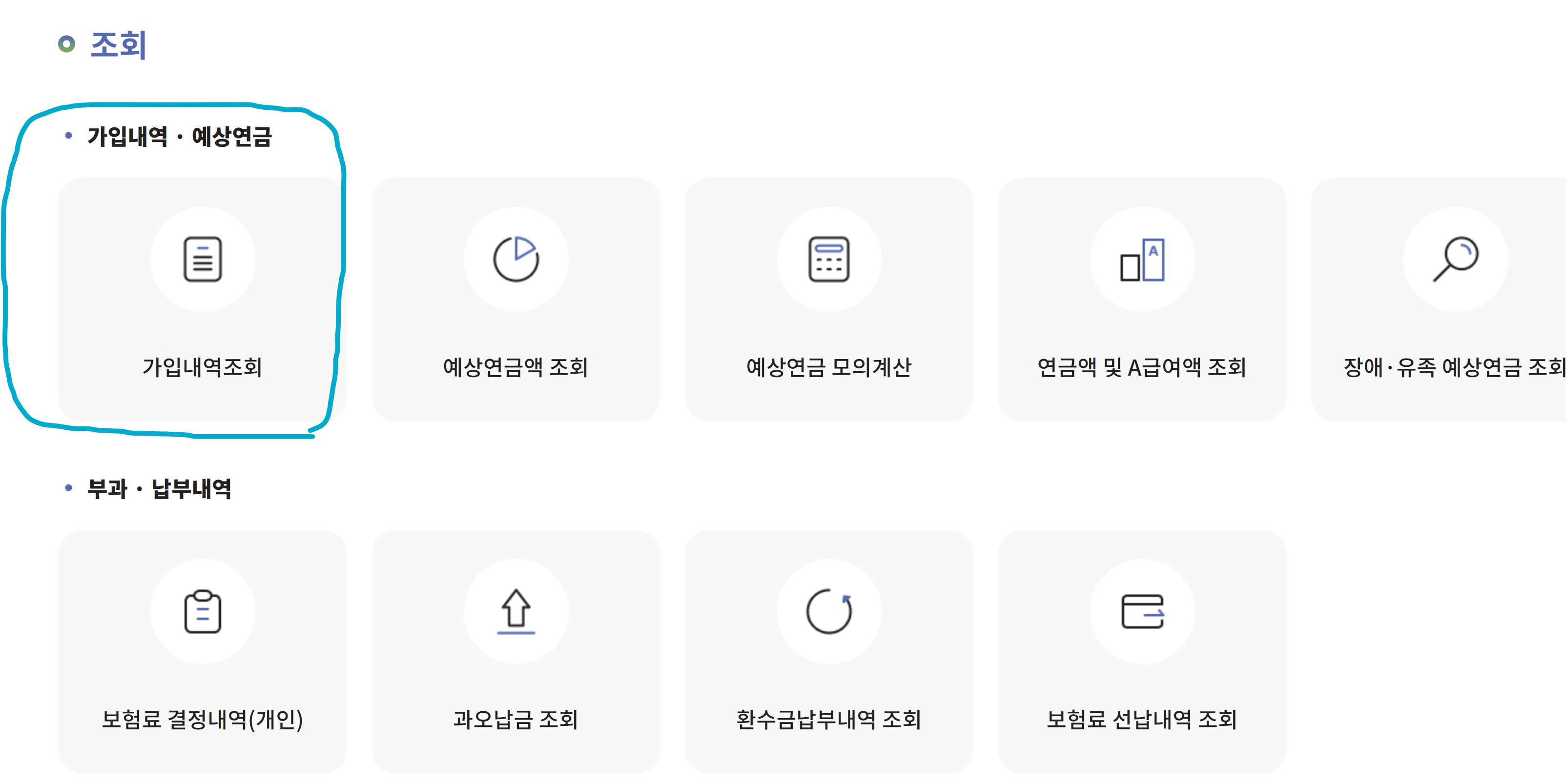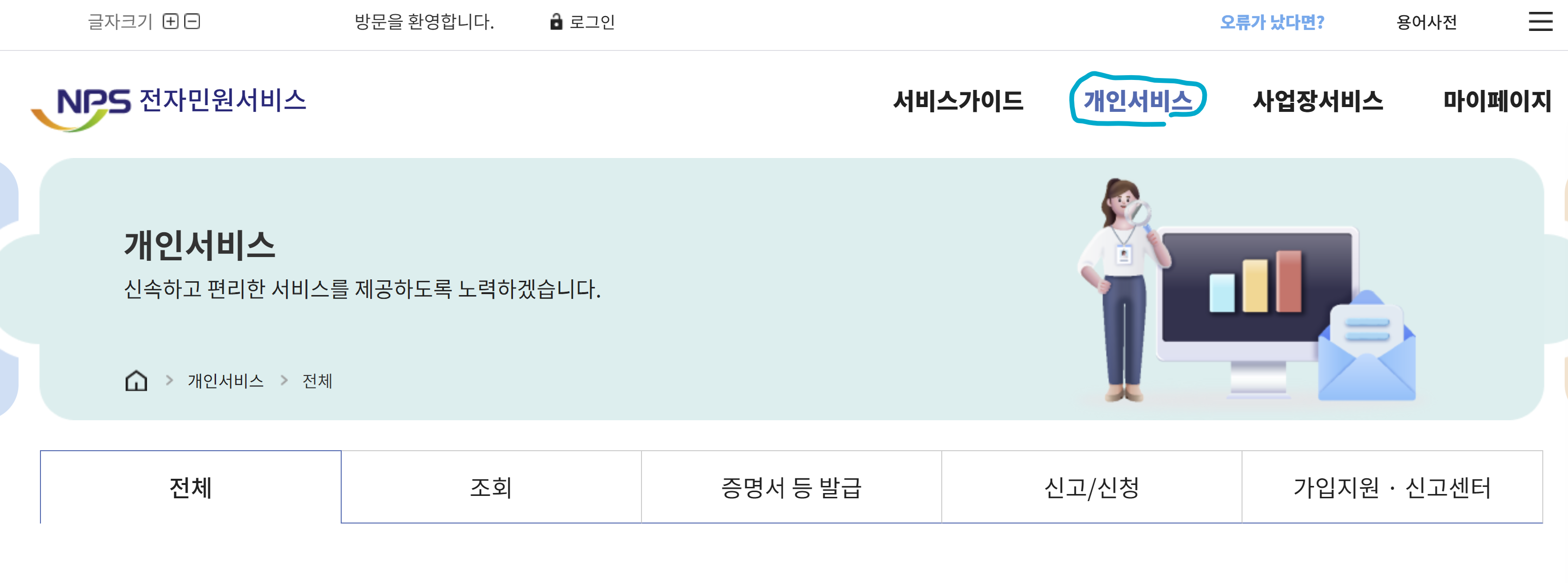 개인서비스를 클릭하고 가입내역조회를 클릭합니다.