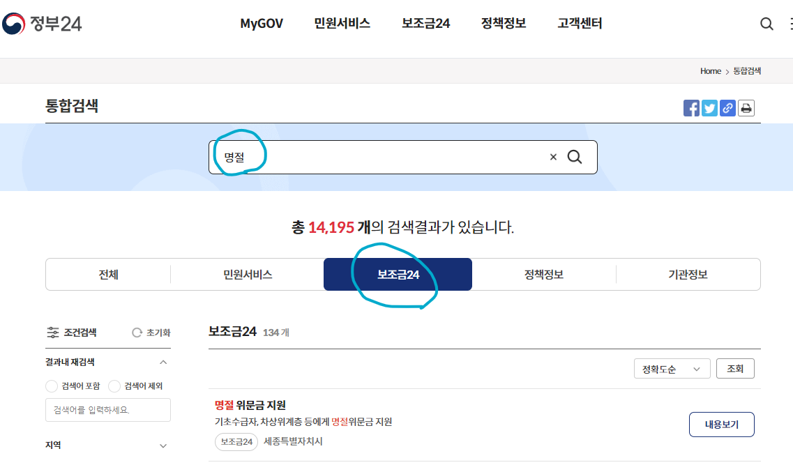 2. 그리고 보조금 24를 클릭하여 나의 조건에 맞는 명절 지원금을 확인합니다!