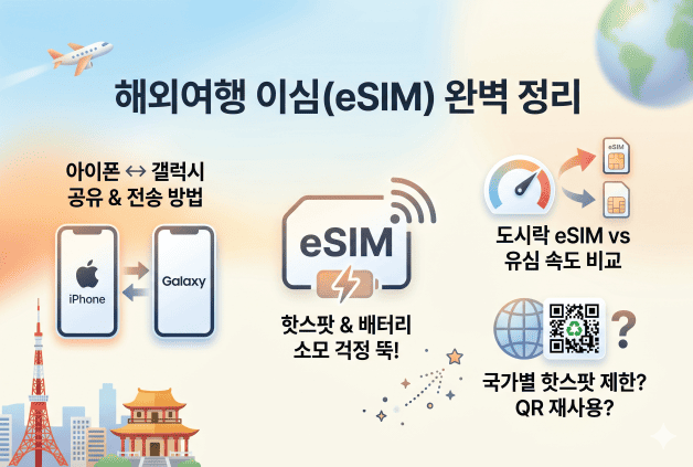 해외여행 eSIM 아이폰 갤럭시 공유가 왜 안 될까요? 아이폰 eSIM 갤럭시 전송 방법, 핫스팟 공유 설정, 듀얼심 설정법, 배터리 소모 해결책까지 실전 트러블슈팅 가이드를 확인하세요.
